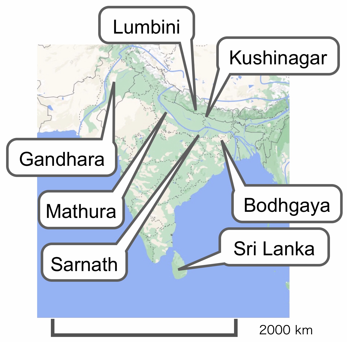 areas including Lumbini, Bodhgaya, and other countries after 500 CE.