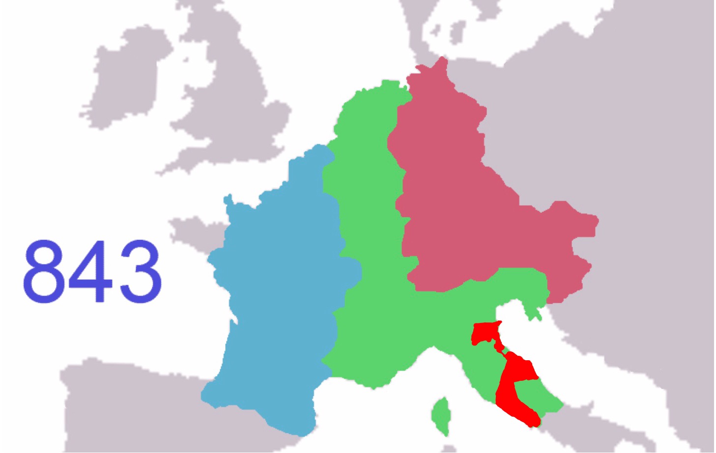Territories of the Frankish Kingdoms as of 843 CE