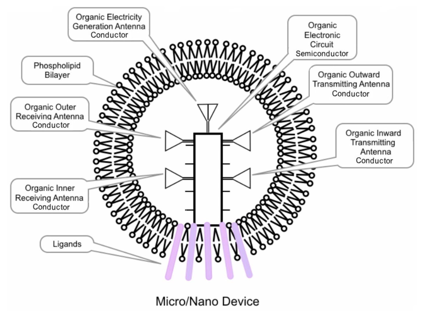 Conversely, when electromagnetic wave signals are transmitted from external antennas, the Outer Receiving Antenna conductor of the micro/nano device receives them, inducing an electric potential difference (voltage) that causes electric current to flow into the electronic circuit semiconductor. The semiconductor then recognizes the micro/nano device's identification number and processes the instructions.