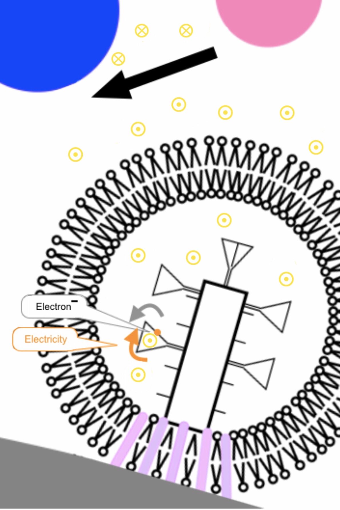 ion (pink circle) (representing electric current) approaches the micro/nano device, a