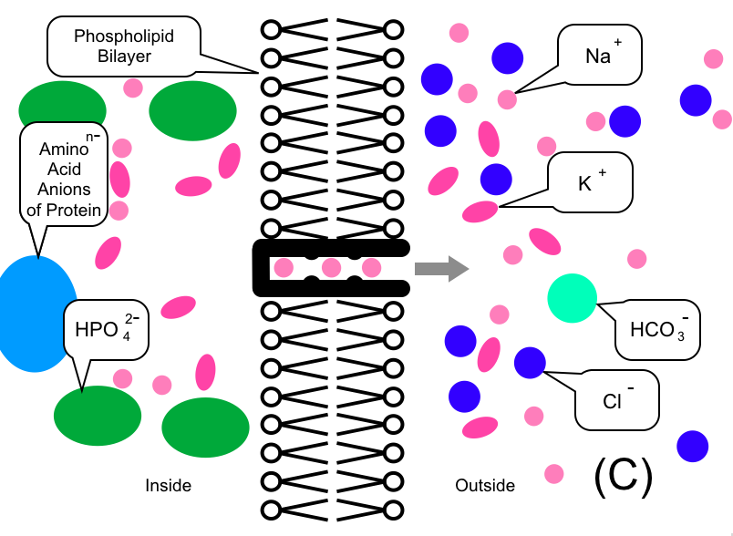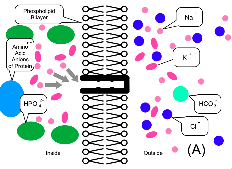 Initially, a simplified state is assumed, as shown in (A). In this initial assumption, the concentrations of Sodium ions (Na+: pink circles) and Potassium ions (K+: red-violet ovals) are the same on both the inside and outside of the cell. Other major electrolytes, such as Chloride ions (Cl-) and Hydrogen Phosphate ions (HPO42-), are placed according to their respective concentrations.