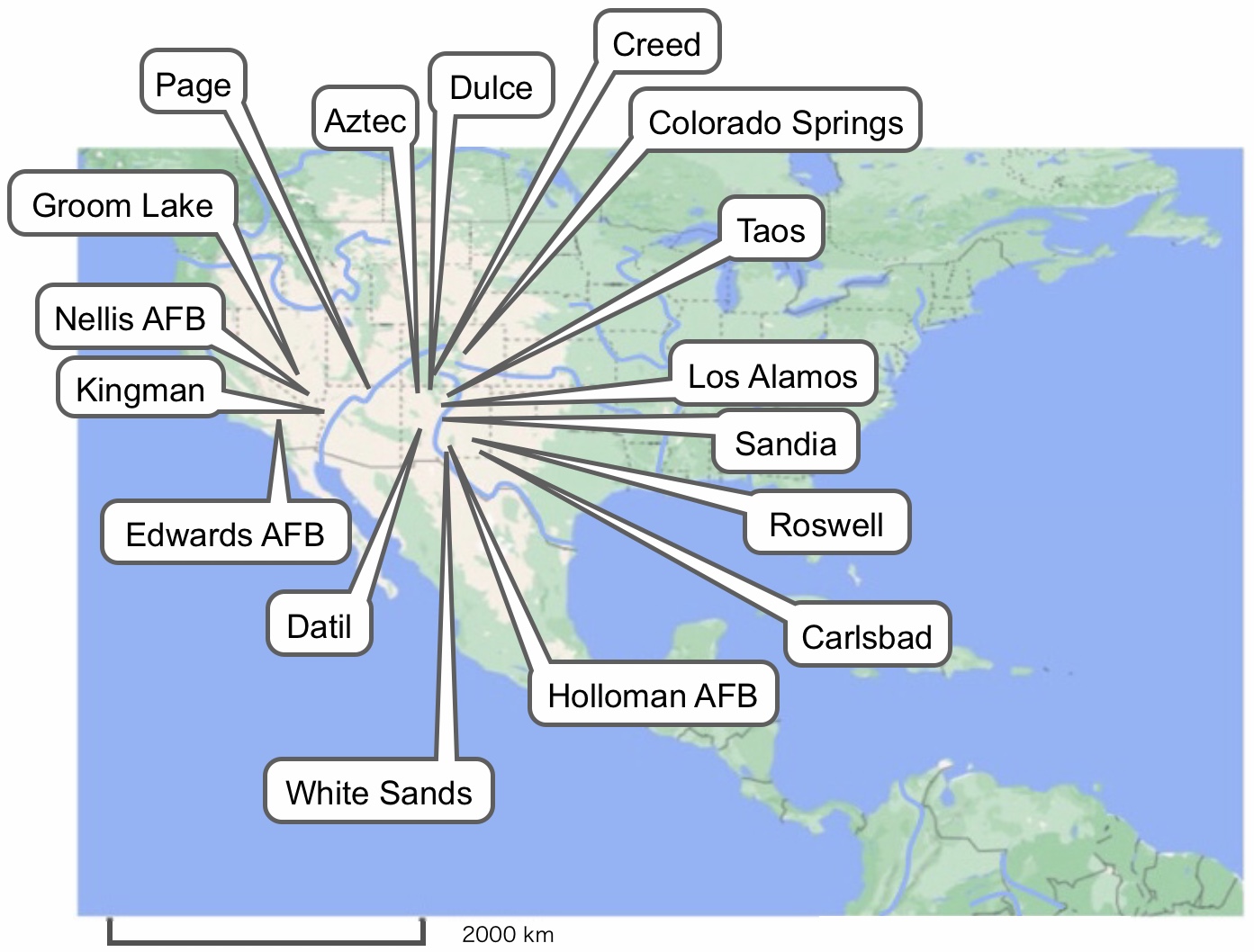 There appear to be extensive underground shuttle tube networks possibly connecting various locations such as Area 51 (Nevada), Page (Arizona), Dulce (New Mexico), Los Alamos (New Mexico), Taos (New Mexico), Datil (New Mexico), Sandia (New Mexico), Carlsbad (New Mexico), Creed (Colorado), and Colorado Springs (Colorado).