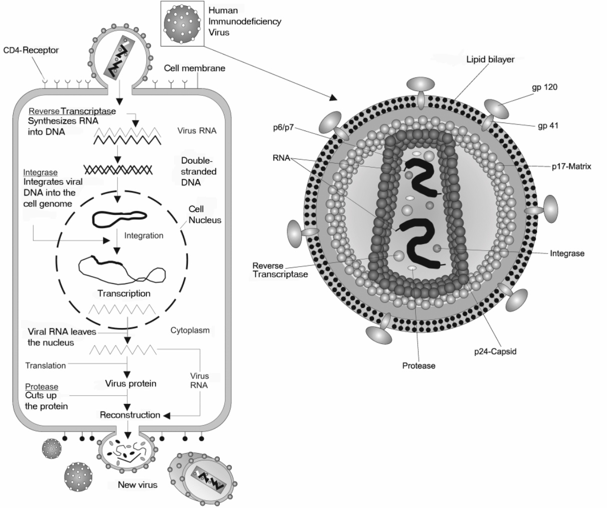 Schematic Cell Infection, Virus Production, and Virus Structure of HIV
