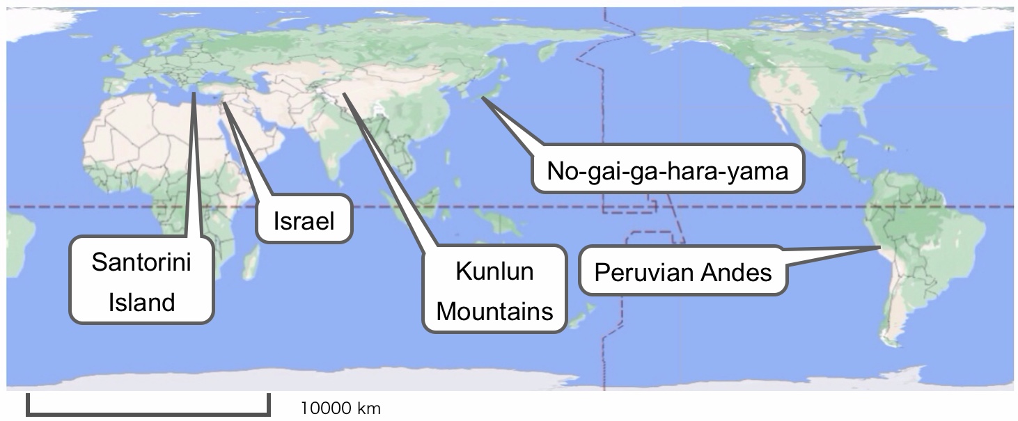in present-day (as of 2015 CE) Israel, Santorini Island (Greek), the Kunlun Mountains (on the north of Tibet),