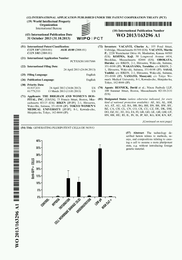 Vacanti, RIKEN, and Harvard University applied Provisional International Patent on April 24, 2012 CE.