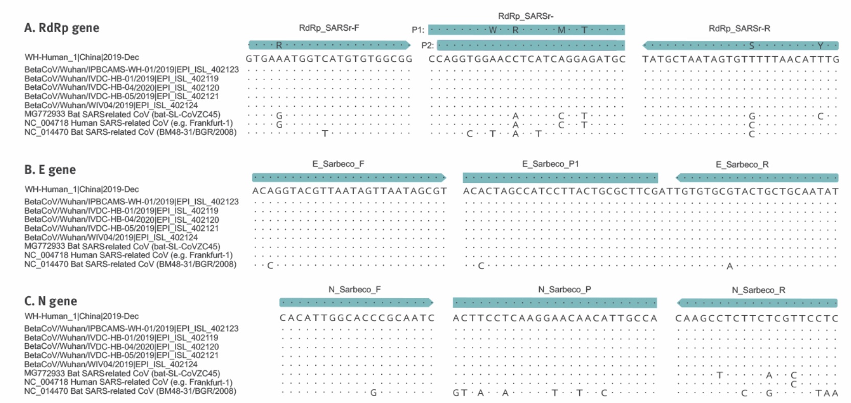 Figure 2. Partial alignments of oligonucleotide binding regions, SARS-related coronaviruses (n = 9)
